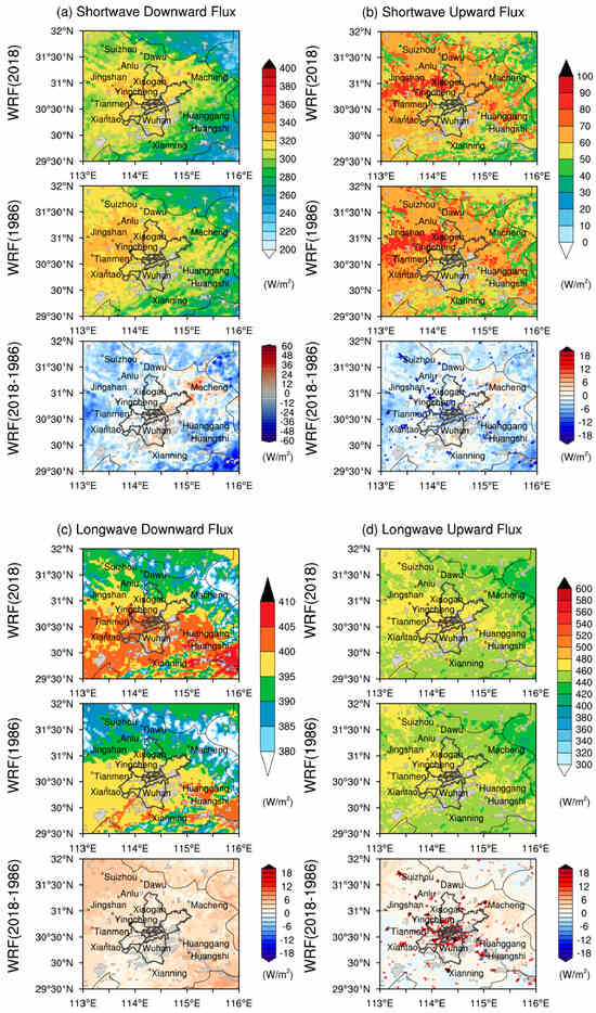 Differences of WRF simulated (a) downward shortwave flux, (b) upward shortwave flux, (c) downward longwave flux, and (d) upward longwave flux between experiments URBAN_2018 and URBAN_1986.