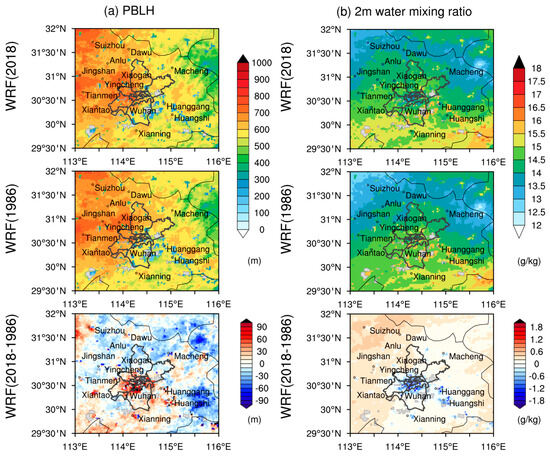 Differences of WRF simulated (a) plenary boundary layer height and (b) 2 m water vapor mixing ratio between experiments URBAN_2018 and URBAN_1986.