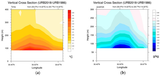 The distribution differences of time-averaged (a) air temperature and (b) water vapor mixing ratio between the experiments URBAN_2018 and URBAN_1986 perpendicular to the cross section along 114.22° E from 30.40 to 30.70° N.