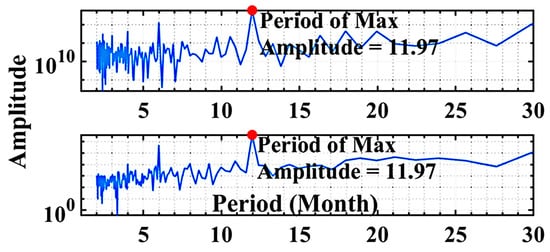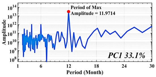 To confirm the adequacy of the revelation of the Indonesian monsoon signal, the fast Fourier transform (FFT) method is applied to analyze the frequency of the PC time series. Analysis of the temporal pattern of Indonesian rainfall based on the PC1 mode is presented in Figure 2. The power spectrum of the associated PC1 for rainfall anomalies shows a prominent spectral peak for a one-year frequency range of the FFT power spectrum of the time series, which means there are six months in the dry phase and another six months in the wet phase (see Figure 3). Such periodicities are characteristic of a monsoon pattern [12,25,45,46,47,48,49,50,51]. Again, these results also confirm the existence of the Indonesian monsoon. The remaining PCs explain non-annual patterns based on FFT analysis of the periodicities of each PC time series generated by SVD analysis, whereas this study aims at only the annual patterns as the primary focus. In addition, the proportion of the SCFs explained by the remaining PCs is relatively small (~15%). Thus, only the PC that shows the annual pattern will be analyzed.