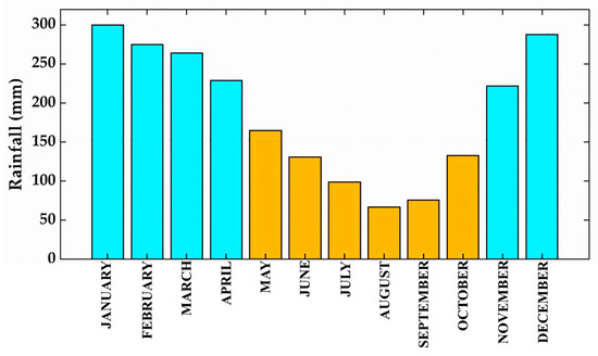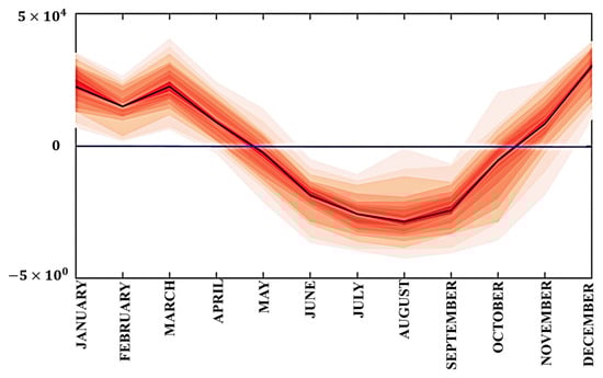 Furthermore, according to [52] the monsoon climate consists of a rainy summer and a dry winter. They contend that precipitation is the most fundamental variable in determining a monsoon climate and the most influential variable in human existence. Subsequently, they put forward two specific criteria to delineate the monsoon climate: (a) a summer-minus-winter precipitation differential exceeding 300 mm and (b) a proportional summer precipitation threshold exceeding 55% of the annual total [52]. The first criterion differentiates a monsoon climate from semi-arid and Mediterranean (trade wind) climates, while the second threshold ensures a distinct summer rainy season and differentiates a monsoon climate from a continuous rain pattern. This concise classification aligns well with the monsoon regions that have been previously delineated using more complex and numerous criteria. Thus, it can be stated that Indonesia’s region fulfills the necessary criteria to be classified as a monsoon regime. The first requirement is depicted in Figure 4, whilst the second criterion is satisfied by going beyond a proportional threshold of summer precipitation of Indonesian monsoon that exceeds 77% of the total annual precipitation.