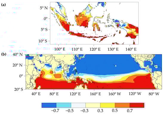 Figure 6 displays the homogeneous map of the first PC that is linked to the variability of Indonesian monsoon rainfall and its corresponding sea surface temperature (SST). The spatial pattern of the first dominant mode is characterized by a strong positive loading of SST in the local Indonesian waters, which can be denoted as an interchange of north–south dipole structures (Figure 6b). This variability is accompanied by a dipole pattern of rainfall showing a negative (positive) variation over the northern (southern) parts of Indonesia (Figure 6a). This implies that a positive phase of local SST enhances rainfall over southern Indonesia, especially where the correlation coefficients are significant. The regional distribution of SST and rainfall again exhibits the characteristic pattern of the Asian winter monsoon during the peak of the boreal winter.