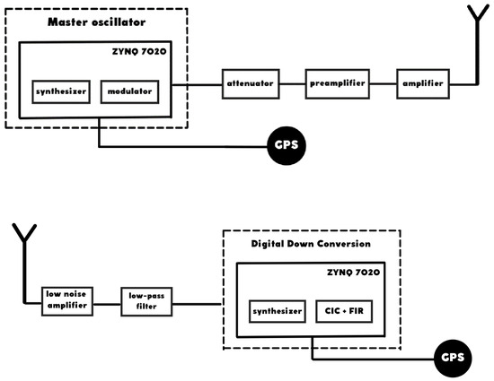 The Red Pitaya SDRlab 122-16 [12] is a development board based on a Xilinx Zynq 7020 system combining an FPGA (programmable logic) and a general-purpose dual-core ARM processor (processing system). The board has a two-channel 14-bit DAC and a 16-bit ADC with a sampling frequency of 122.88 Msps, and Ethernet and USB 2.0 interfaces for networking with external devices (PC). This board is used as a reference oscillator (probe pulse generator) in the prototype currently being tested in continuous mode. Another identical board acts as a receiver. Figure 3 shows a photograph of the ION-FAST ionosonde receiving part temporarily placed in a cardboard box (as a housing) in a laboratory building. The previous solution for the receiving part of the ionosonde prototype [13] was based on a two-channel SDR device of a LimeSDR with an operating frequency range of 100 kHz to 3.8 GHz and able to capture signals with a bandwidth of 61.44 MHz [14]. The LimeSDR did not allow us to dynamically adjust the local oscillator frequency (sweep), so we had to write a signal over the entire band of 10 MHz, which in turn did not allow us to process real-time data and obtain ionograms immediately. Using a second, similar Red Pitaya board as a receiver in combination with two GPS reference generators (for the receiving and transmitting parts) made it possible to synchronize the local oscillator sweep and record the registered signal in a narrow band (200 kHz). All of this together allows us to obtain results in real time. Now, the transmitting and receiving parts of the ionosonde are unified, which made it possible, on the one hand, to simplify the structure of the layout, and on the other, to expand its functionality by implementing the chirp function of the receiver, described in this article.