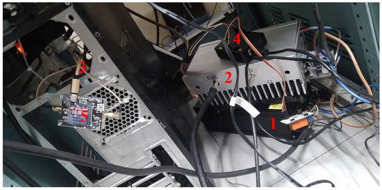 The transmitting part of the ION-FAST ionosonde without a case. The numbers indicate the following: 1—an amplifier power supply, 2—an A600 amplifier, 3—a 5 W preamplifier, 4—an SDRlab 122-16 in a 3D-printed case as a master oscillator, 5—a programmable attenuator.