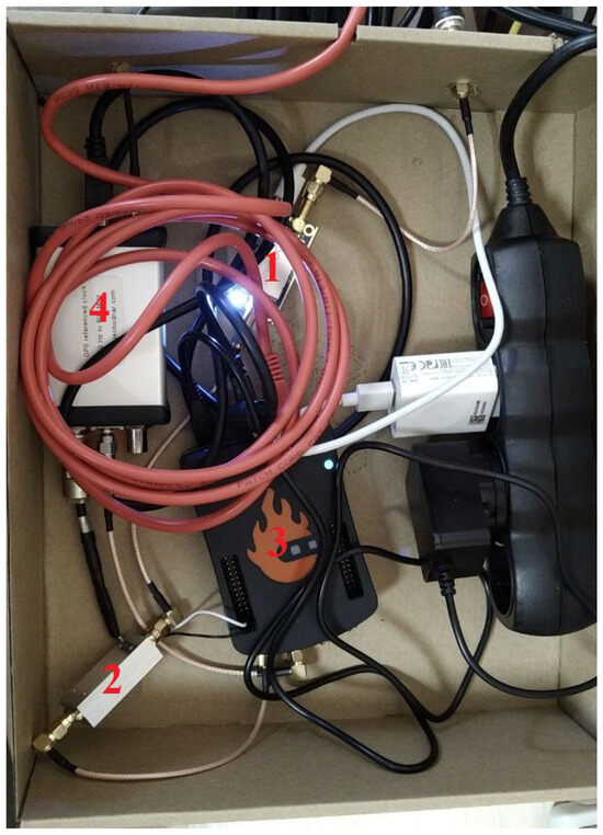 The receiving part of the ION-FAST ionosonde without a case. The numbers indicate the following: 1—a low-noise amplifier, 2—a low-pass filter, 3—an SDRlab 122-16 in an aluminum case, 4—a Leo Bodnar precision GPS reference clock.