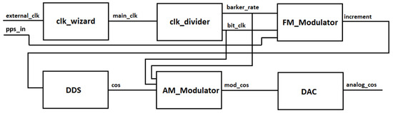See Figure 4 for the SDRlab 122-16 card master oscillator firmware flowchart. To implement the master oscillator firmware, we used the Verilog hardware description language in the Xilinx Vivado development environment and embedded Xilinx IP cores. Compared with the previous version of firmware, we added a PPS clock signal for synchronous start of both the transmitting and receiving parts of the ionosonde.