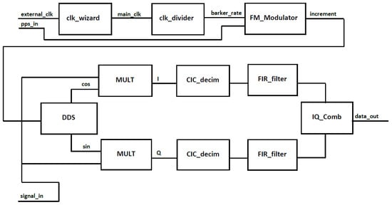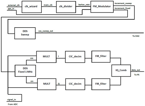 In the wake of increasing interest in short-wave radio communication, the task of developing new diagnostic equipment for monitoring the characteristics of radio links is becoming increasingly urgent. The ionosondes of oblique sounding using a chirp signal (chirp ionosondes) can effectively solve this problem. A comprehensive overview elucidating the need for a chirp ionosonde and its role in radio communication diagnostics can be seen in [17]. For an adequate response to modern challenges, the developed equipment must meet the following criteria: multifunctionality, compliance with world analogues in terms of technical characteristics, and accessibility. SDRs have been successfully used for oblique ionospheric sounding since the late 2000s [18]. The existing solutions can be divided into two categories: professional and DIY. Moreover, the latter are often in no way inferior to the former. Professional solutions use versatile, high-speed SDR devices (like the Ettus Research USRP N210 [19]) and a suite of proven software [20] that uses major software packages such as GNU Radio [21]. DIY solutions use self-made SDRs (e.g., [22]), usually combining ADCs and FPGAs that have an interface for communication with a PC (as in professional solutions). A distinctive feature of all of the noted solutions is that the PC receives a digital stream of samples with a bandwidth of ≥25 MHz, which provides coverage of the entire HF range (3–30 MHz). Processing such a high-speed stream of samples on a PC requires considerable computing resources and optimized algorithms. Another type of existing DIY chirp receiver uses software control of the HF transceivers (e.g., [23]), which ensures that a received frequency changes synchronously with the chirp transmitter. In this case, signal registration on the PC is performed in a narrow band (usually 16–24 kHz) [24]. In a number of solutions, a specialized direct digital synthesis (DDS) chip is used instead of an HF transceiver. In this case, a narrow reception bandwidth is achieved by implementing the digital down converter (DDC) function [25,26]. At this moment, we have a prototype of the receiving part of this kind of a station implemented on the existing ION-FAST platform. In the current implementation, our solution is close to solutions using DDS and DDC. The difference is that DDS and DDC in our solution are implemented not with the help of separate chips, but on the FPGA. In addition, in the future, our solution will not require a separate PC for DSP.