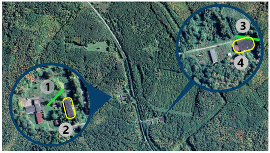 The ION-FAST placement features while in trial operation at “Vasilsursk” experimental base. Green lines represent installed T2FD antennas, yellow circles— buildings where the hardware is placed. The numbers indicate the following: 1—receiving antenna, 2—laboratory building, 3—transmitting antenna, 4—instrument room.