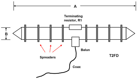 The principal design of the T2FD antenna. Characteristics of the antennas we use are as follows: size A—53 m, size B—0.46 m, operating range—2–30 MHz, peak input power—2 kW.