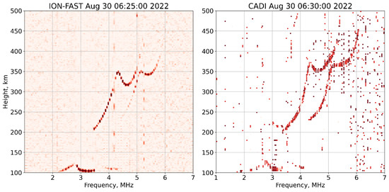 The ION-FAST has two main operating modes. The first one is a daily monitoring mode. The Ionosonde starts every 5 min, except on the 0th, 15th, 30th and 45th minutes of each hour. The prototype makes 60 full 1 s cycles and then performs averaging over 60 ionograms (total 1 min averaging). Thus, the ION-FAST has the same effective time for obtaining an ionogram as the CADI ionosonde. The exception of the 0th, 15th, 30th and 45th minutes is due to the schedule for starting the CADI ionosonde. This is necessary to avoid interference. Using both the ION-FAST and the CADI ionosondes, we can simply compare the registered ionograms and verify the obtained results. This approach provides more reliable information about the state of the ionosphere. Figure 8 shows a comparison of ionograms obtained in the daily monitoring mode with the same registration time for both of the ionosondes. The presented images clearly demonstrate that the behavior of the dependence of the effective height of reflection on the frequency of the radio pulse in both of the pictures is similar. Furthermore, the values of the effective reflection height obtained by the two ionosondes coincide, taking into account the time difference of 5 min. For example, fOF2, determined from the ION-FAST ionogram, was 5.3 MHz, and from the CADI ionogram, 5.4 MHz. Although this comparison is made to check the results of ION-FAST, it is noticeable that the trace on the left graph is sharper and cleaner, and the dynamic range is greater. You can see additional examples of 60 s ION-FAST’s ionograms in Figures S1 and S2.