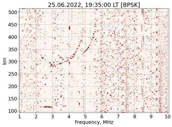 The second mode is fast registration. The presence of this mode partly determined the name of the prototype. In this operating mode, ION-FAST allows obtaining ionograms with a time resolution of about 1 s, which is required to monitor the fast processes in the ionosphere during heating experiments, because the characteristic times of the processes of the redistribution of the electron concentration over height during such experiments are also of about 1 s. Such an experiment was performed in August 2022. The combination of two 53 m T2FD (transmitting and receiving) antennas provided a signal-to-noise ratio of about 32–34 dB (at the radiated power of 600 W) that affected the quality (noisiness) of the obtained ionograms in comparison with the 1 min averaging, though the altitude–frequency profile information could be recovered (see Figure 9). In [13], we presented some results with 1 s ionograms, but they were obtained on a set with more sensitive antennas that had better characteristics and gain.