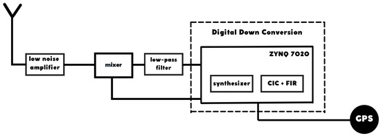 The current version of the chirp ionosonde receiver consists of (1) a low-noise amplifier with a gain of approximately 20 dB; (2) a low-pass filter with a pass band of 20 MHz; (3) a Red Pitaya SDRlab 122-16 SDR device; (4) a Leo Bodnar precision GPS reference clock; and (5) an analog mixer. Unlike the vertical ionosonde prototype, in the chirp-sounding receiver, we used a combination of analog and digital down conversion. The external analog mixer and the low-pass filter, as a pair, handle conversion of the input chirp signal to a frequency of 1 MHz using a Red Pitaya device as the source of a local oscillator signal with linear frequency modulation. It is necessary to meet the Red Pitaya analog input requirements determined by a high-pass filter. Then, we perform the digital down conversion after the ADC on the FPGA using DDS with a fixed output frequency of 1 MHz. As in the vertical ionosonde, we used a Leo Bodnar Precision GPS reference clock as the source of the reference clock signal for the FPGA and the source of the PPS signal for synchronization of the sweep between the transmitter and the receiver. Another difference concerns the antenna we used. In the chirp-sounding ionosonde receiver prototype, we employed a CT-HF-FD antenna. Figure 10 illustrates a block diagram of the newly developed chirp-sounding ionosonde receiver prototype.
