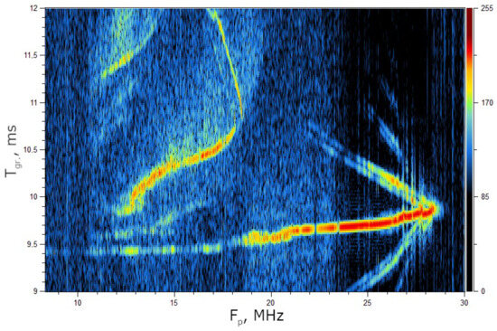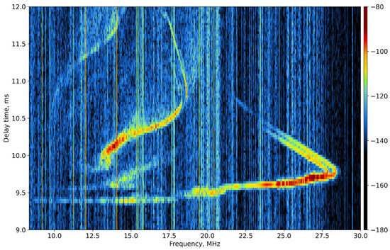 It should be noted that the commercial ionosonde uses proprietary software, which implements ionogram filtering for stationary interference. This function has not yet been implemented in our ionosonde. Otherwise, all of the characteristic features of wave propagation along the HF channel, which can be emphasized from one ionogram, are also visible on the other. In Figure 13, in the frequency range of 22–28 MHz, a reflected signal with delays of <9.5 ms is visible. This is a well-known artifact associated with the reception of strong signals and the auto gain control operation in a commercial ionosonde. Because of the fact that we have full control over the DSP in ION-FAST, such problems are excluded.