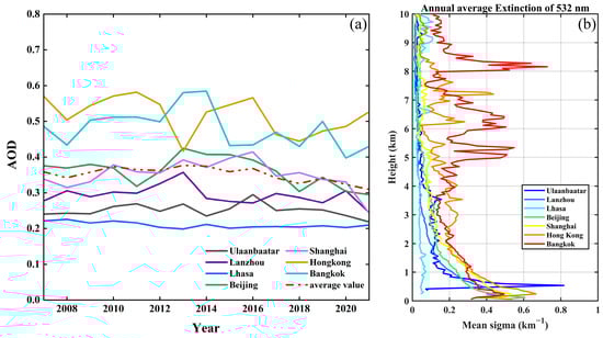 4.1. Analysis of Annual AOD and Vertical Extinction Distribution