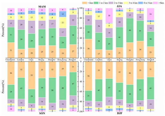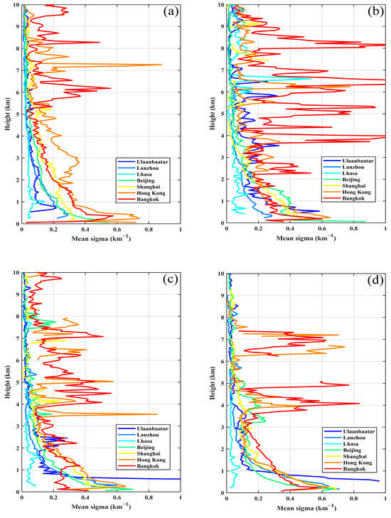 - Except for Lhasa, higher extinction coefficient values were observed below 1 km in all other cities during all four seasons. The highest extinction coefficient value in Lhasa occurred at an altitude of approximately 7 km during summer.
