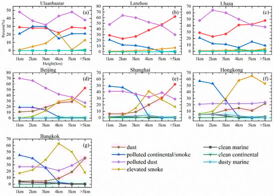 - Dust, polluted continental/smoke, polluted dust, and elevated smoke played dominant roles in various aerosol layers in all cities. On the other hand, the proportions of clean marine, clean continental, and dusty marine were very small, all below 5% in all aerosol layers of all cities.