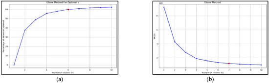 Elbow method results to determine optimum number of clusters for k-means: (a) total variance explained by the number of clusters; (b) Within-Cluster Sum of Squares (WCSS) by the number of clusters.