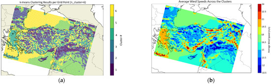 The k-means clustering successfully characterized the wind dispersion patterns in the Aegean Region, considering the influence of the terrain. Nevertheless, the impact of the Black Sea and Mediterranean Region Mountain ranges on Central Anatolia was adequately represented by the k-means clustering algorithm with a 6-cluster test (Figure 7a). Also, the average values of all clusters were illustrated in Figure 7b. The resulting graph was used to highlight the cluster grid points in terms of contour plots.