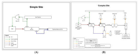 (A) Simple site configuration. The MAES model assumes such sites are composed by one continuous well and a high-pressure separator operating at 204.5 psia. (B) Complex site configuration. The MAES model assumes such sites are composed of 2 continuous wells; 2× stage 1 separators operating at 118.65 psia, 1× stage 2 separator operating at 39.65 psia, and 1× VRT in the 3rd stage of separation at 16.79 psi; 1× water tank battery; 1× oil tank battery; 1× 1029 kW 4SLB driver for a reciprocating compressor operating as a gas lift; 1× 108 kW 4SRB compressor at the second stage of separation operating as a VRU; 1× 70.8 kW 4SRB compressor at the third stage of separation operating as a VRU; 2 flares: one connected to a water tank and the other to an oil tank.
