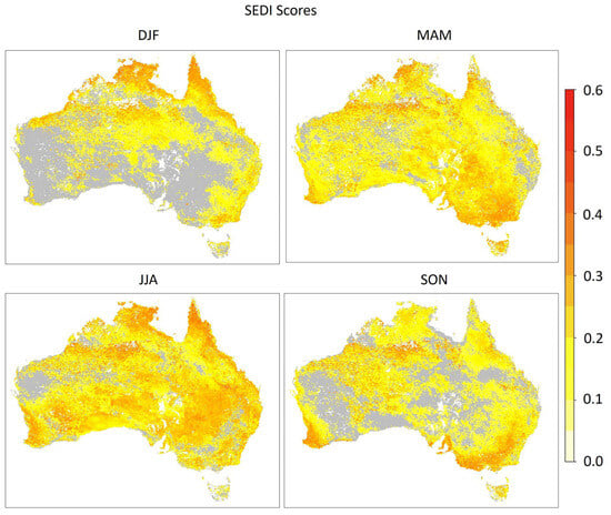 A decrease in the areas with significant forecasting capacity occurs in SON, which is again problematic, given not only the large portion of Australia prone to high fire danger in this season [,,] but also the considerable trend towards increasing fire danger in SON [,,,,]. SEDI scores are highest during this season in southeast and southwest Australia, which are areas prone to high fire danger in spring [,], but increases in severe fire conditions are projected for central and northwest Australia [], which have incomplete predictive skill in ACCESS-S2.