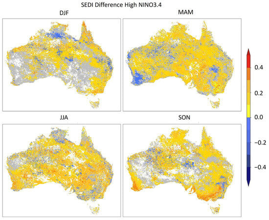 Episodes of El Niño increase the predictive skill of ACCESS-S2 over much of Australia in DJF (Figure 2). Importantly, these increases in SEDI skill scores coincide with areas where El Niño is associated with increased chances of extreme FBI, including the far north and parts of southeast Australia. These areas of improved skill are most aligned with observed increased chances of top-decile FBI, but some similarities to the modelled results are also present []. In MAM, there are increases in the SEDI scores over most of Australia when an El Niño phase is active. This is noteworthy, given the autumn predictability barrier often confounds the modelling of ENSO and its impacts in MAM. There is a marked decrease in predictive skill in southwest Western Australia (WA) and in inland NSW. However, throughout the hindcast period in this season, El Niño is associated with an increase in fire danger only in the northern reaches of Australia [], so El Niño may not be an important driver for predicting periods of extreme FBI in southwest Australia and inland NSW in autumn. Conversely, prediction skill in southwest WA shows a strong response to El Niño in JJA and SON, associated with an overall increase in SEDI score compared with the neutral case. An exception occurs in JJA, with a slight decrease in predictive skill in southeast Australia when El Niño is active, which coincides with an area where a stronger-than-observed increase in the chance of extreme FBI is simulated by the model []. Increases in skill are generally observed elsewhere across the continent. In SON, there is again a general increase in SEDI scores, especially in the regions where increased probabilities of extreme FBI are observed and simulated in association with El Niño []. This is expected, given the pronounced impact of El Niño on rainfall and temperatures in SON, and the active fire danger usually present in Southern Australia during this season [,]. It also provides end users of FBI forecasts with additional confidence in the forecasts when an El Niño is active or forecast. Observed increases in Southern Australian fire danger associated with climate change in spring are projected to continue, making fire danger prediction and preparedness particularly important in this season [,,,]. Additionally, an expected trend towards more frequent and intense El Niño events under climate change conditions [] highlights the potential usefulness of this driver as a predictive factor now and into the future.