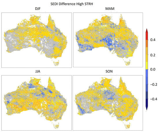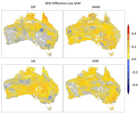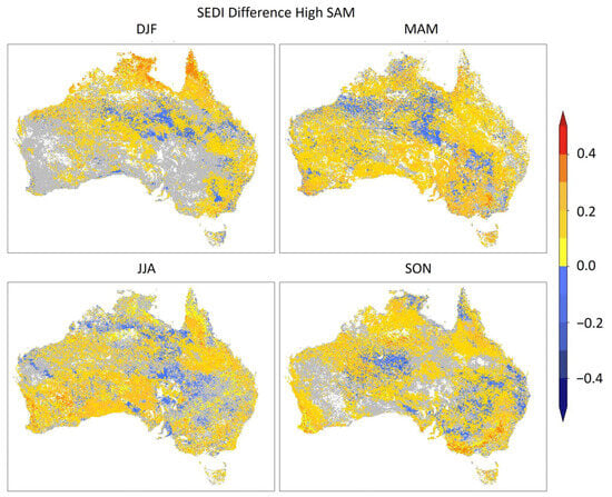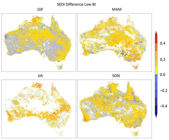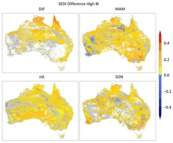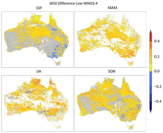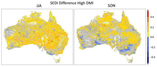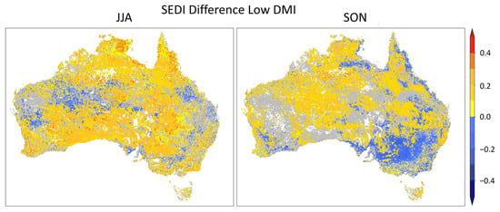 Predictive skill is improved across Australia when the IOD is positive in JJA (Figure 6), which is associated with lower rainfall and increased chance of extreme FBI over most of the country. This phase stands out as the most influential climate driver for increasing the chance of top-decile FBI in JJA in some parts of Australia [], so the high skill of ACCESS-S2 in predicting extreme fire danger in association with the positive IOD is important for decision-making and for understanding FBI forecasts. Slightly lower skill is available in SON, with still predominantly positive SEDI score differences overall. Less skilful forecasts have been available for the negative phase in either season (Figure 7), due to an impaired ability of ACCESS-S2 to capture the magnitude and footprint of the changes in event probability associated with the IOD []. Caution is therefore warranted when interpreting FBI forecasts, particularly in negative IOD events, as historically, this has produced inaccurate results in Central and Eastern Australia in JJA, and areas of southeast, southwest and Northern Australia in SON.