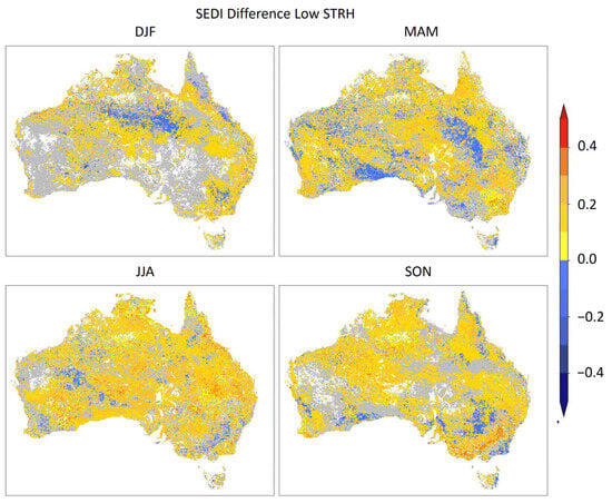 In both phases of the STRH and in all seasons, ACCESS-S2 shows mixed ability to predict associated probabilities of extreme FBI. Most instances of observed and simulated high probability of upper-decile FBI associated with positive STRH, importantly in the north [], correspond with areas of increased forecasting skill (Figure 8) compared with when all available forecasts are used. This improved prediction is particularly evident in the Cape York region, where positive STRH is consistently associated with higher fire danger. Consistent increases in forecasting capacity are evident in Tasmania as well, where aridity and warm air advection result in an increased likelihood of extreme FBI in all seasons []. These results show potential for increased confidence in FBI forecasts in Northern Australia and Tasmania when the STRH is positive. The positive results are not sustained in the low phase of the STRH (Figure 9), with ACCESS-S2 showing a decreased ability to predict the observed increased probability of extreme fire danger in Eastern and southeastern Australia. Despite ACCESS-S2 quite accurately reproducing the observed effects of negative STRH events on extreme fire danger in DJF, MAM and SON [], there are minor differences in the magnitude or exact spatial footprint of the probability ratios, which cause compromised forecast skill. Improvements to known biases in geopotential height representations by ACCESS-S2 may improve the predictive skill associated with negative STRH.