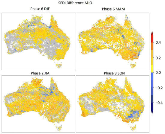 Phase 3 (Figure 12) is a critical phase for extreme FBI events in SON. Maximum and minimum temperatures coincide with decreased rainfall in southeast Australia [,], which would be expected to drive high FBI in the active fire season. SEDI scores for predicted extreme FBI in southeast Australia are lower than climatology for this phase. Although ACCESS-S2 shows improved skill for the southernmost coast, a large region of inland southeast Australia has decreased predictive skill. Surprisingly, the observed likelihood of extreme FBI in this region is lower than what is simulated []. This difference does not indicate a lack of skill in the model’s representation of phase 3 impacts, but may rather be due to the short FBI record and an inadequate representation of phase 2 events in the SON dataset. Regardless of the cause, these results show that MJO phase 3 does not play a key role in providing predictive skill in this region, and the activity of other climate drivers should be carefully considered.