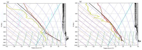 Sounding temperature–wetness stratification curves can be used to analyze the changes in temperature and wetness conditions in the atmosphere before and after the appearance of heavy rainfall, and also to determine the stability of the atmospheric stratification [52,53]. The heavy precipitation process was captured by an outfield encrypted sounding experiment in Kashgar in July 2021. At 11:00 on 18 July, the whole layer of the storm area was wet, and the thickness of the wet layer varied from 700 hPa to 400 hPa, with the winds at the lower level from the easterly direction (Figure 12a). At 00:00 on July 19, the supply of water vapor from 500–400 hPa at the western boundary resulted in dryness in the middle and upper wet layers of the storm area, with a large direct temperature decrease, unstable energy generation and a smooth transition of winds in the lower level (Figure 12b). At 05:00 on 19 July, the transport of water vapor from the upper level of the southern boundary resulted in dryness in the lower part of the storm area, with a large vertical wind shear in the 850–600 hPa range, a warm advection at 750–600 hPa and a warm advection in the 600–400 hPa range (Figure 12c). At 11:00 on the 19th, the lower and middle layers were wet, and the upper layers were dry, the temperature and dew point curves were in the shape of a “trumpet”, the temperature direct reduction rate was large and the CAPE value increased to 588 J/kg (Figure 12d), which was favorable for the occurrence of heavy rainfall.
