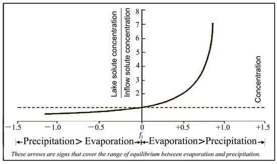 where 1 represents the balance, (v)evap is the average volume of water lost by evaporation, (v)prec is the average volume of water gained from precipitation, and (v)infll is the average volume of water flowing into the lake. The greater the net evaporation, the more concentrated the lake solutes become, with the relationship being hyperbolic. The major ions found in Salt Lakes are the same as those in fresh waters, namely Na+, K+, Ca2+, Mg2+, Cl−, SO42−, and CO32−/HCO3−, but their ionic proportions differ [27].
