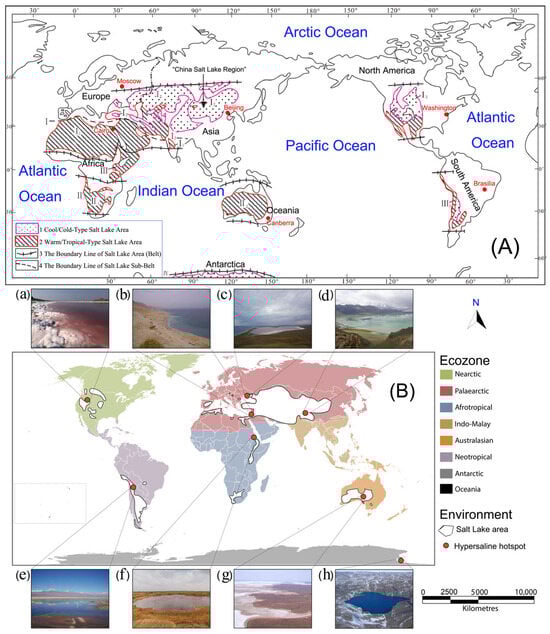 (A) Global distribution of Salt Lakes (shaded areas using black lines and dots). (B) Worldwide Salt Lake areas with the main hypersaline hotspots. (a) Great Salt Lake (Utah, USA), (b) Dead Sea (Israel), (c) Crimean Salt Lake (Crimea), (d) Dangxiong Co Salt Lake (Tibet, China), (e) Laguna Puilar, Salar de Atacama (Chile), (f) Gaet’ale Pond (Ethiopia), (g) Kati Thanda-Lake Eyre (Australia), and (h) Deep Lake (Antarctica). Oceania is illustrated in black within the rectangle at the bottom left corner of the map (adapted from Mattia Saccò 2021 [33]).