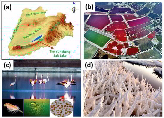 The ethereal beauty of the Yuncheng Salt Lake (located in Shanxi Province, China), combined with its ecological and economic value, establishes it as a site of both natural wonder and cultural significance. (a) Location of Yuncheng Salt Lake. (b) Color pools due to different salinity and algal growth. (c) Salt Lake biodiversity. (d) Salt crystallization and accumulation under low temperature.