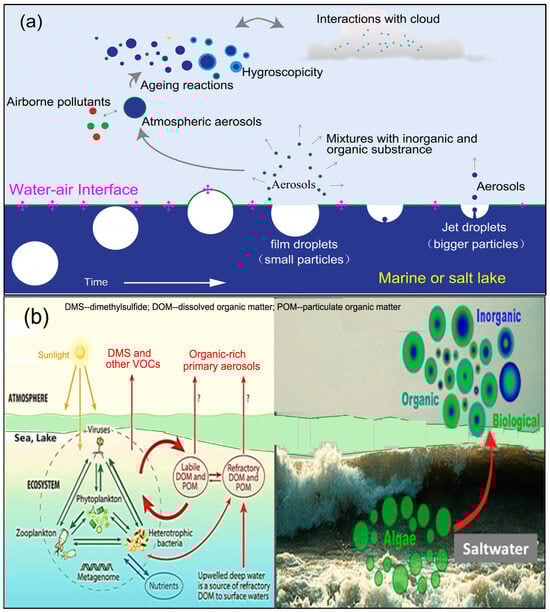 Mechanism of Salt Lake aerosol generation: (a) aerosols generated from film and jet droplets; (b) possible organic and inorganic components of Salt Lake aerosols.