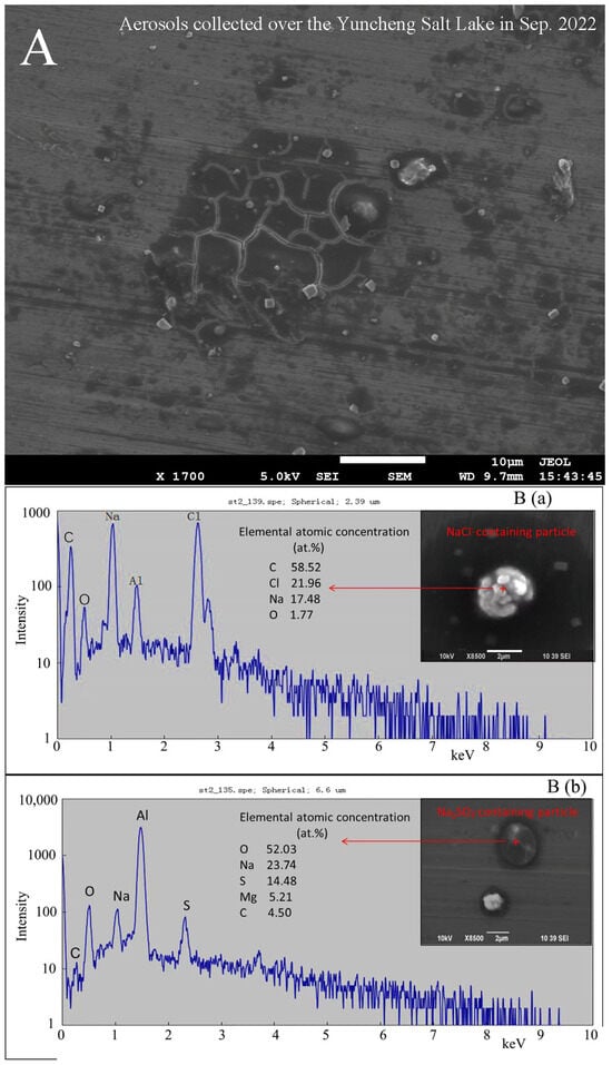 A few examples of morphology and chemical composition of Salt Lake aerosols (SLAs). (A) The secondary electron images (SEIs) of Salt Lake aerosols collected over the Yuncheng Salt Lake, Shanxi Province, China, in September 2022. (B) The typical SEIs by SEM-EDX and elemental atomic concentrations of (a) a NaCl-containing particle; (b) a Na2SO4-containing particle, in Yuncheng Salt Lake aerosols collected on Al foil in September 2022 by the authors. The high aluminum peak in the EDX spectrum is attributed to the Al foil, used to collect the atmospheric aerosols. (C) The SEIs and EDX spectra of atmospheric aerosols collected during a dust storm episode: (a) a Na-, S-, and Cl-rich particle, likely from dried salt-lakes and saline soils; and (b) a common dust particle (Zhang et al., 2009 [7]).