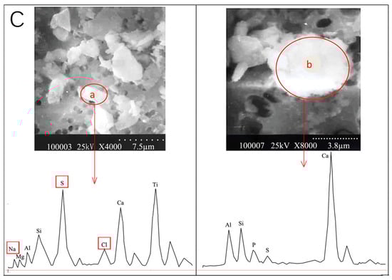 The typical NaCl- and Na2SO4-containing aerosols were identified from the individual particle samples collected over the Yuncheng Salt Lake (Figure 5). Through SEM-EDX, not only the morphology and chemical compositions of NaCl- and Na2SO4-containing particles were illustrated, but also the elemental atomic concentrations were obtained using Monte Carlo Simulations by a modified CASINO Monte Carlo program [83,84]. The quantitative elemental composition analysis by low-Z particle EPMA revealed the atomic concentrations of a NaCl-containing particle as C 58.52%, Cl 21.96%, Na 17.48%, O 1.77%, and of a Na2SO4-containing particles as O 52.03%, Na 23.74%, S 14.48%, Mg 5.21%, and C 4.50% (Figure 5B). It is noted that a high concentration of C is included in the NaCl-containing particles, and dark shades encircle particles in the secondary electron images (Figure 5A,B), suggesting that a large amount of organic substance is included in the Salt Lake aerosols.