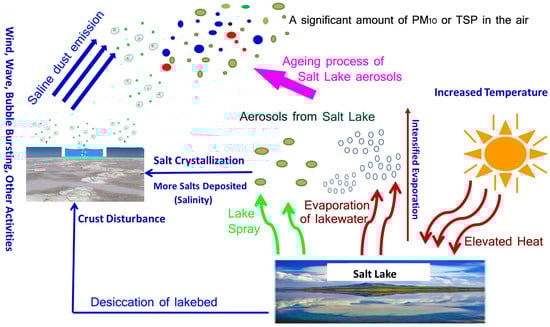 The increasing temperatures, wind speeds, and heightened evaporation associated with climate change are contributing to a more arid environment. This aridity facilitates wind action, which becomes a prominent factor in the enhanced production of aerosols from Salt Lakes. As the salinity levels in the lakes rise, more salt-containing fine particles will be formed and entrained into the air. In the Salt Lake region, the dust aerosols, often containing salts and other minerals, become a significant component of the overall Salt Lake aerosol load. In addition, changes in the Salt Lake ecosystem due to climate shifts can impact biological processes therein. This will lead to modifications in the release of biogenic compounds from algae, bacteria, and other microorganisms present in the water, which further contribute to changes in the size, number, and chemical composition of Salt Lake aerosols.