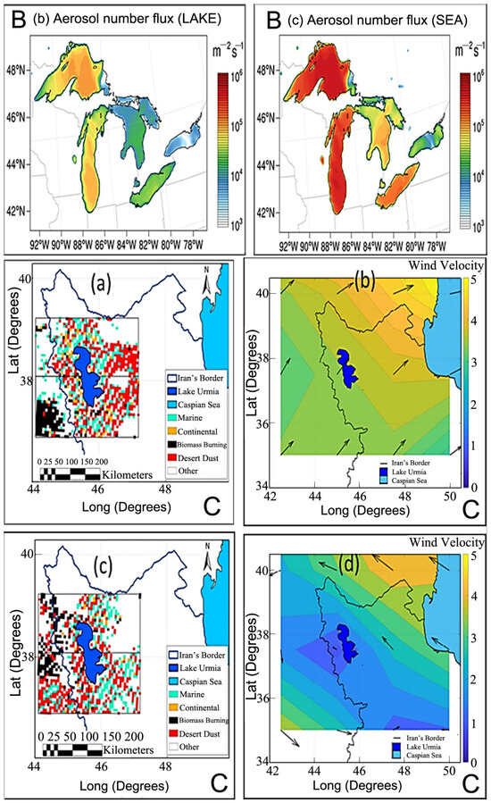 Aerosol generation under temperature ((A), adapted from [59]). (B) Lake spray aerosol emission flux under wind speed (a–c) (adapted from [92]). (C) Aerosol types and wind velocity in March 2016 (a,b) and June 2016 (c,d) (adapted from [93]).