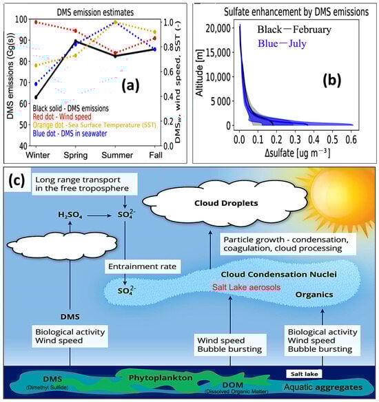 (a,b) Dimethylsulfide emission and sulfate enhancement. (c) Salt Lake aerosols as cloud albedo agent (Modified from Sarwar et al., 2023 [124]).