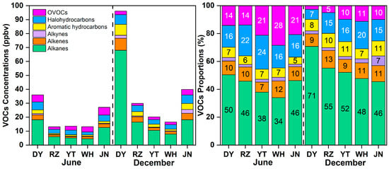 Diurnal variation of VOC concentrations in coastal cities (Dongying (DY), Rizhao (RZ), Yantai (YT), and Weihai (WH)) and an inland city (Jinan (JN)) in June and December.