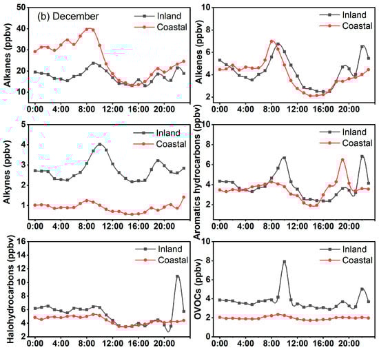 Figure 3 shows the diurnal variations of VOC concentrations in coastal and inland cities during June and December 2021. The concentrations of alkanes, alkenes, alkynes, aromatic hydrocarbons, and halohydrocarbons exhibited a decreasing trend during the daytime and an accumulating trend during the nighttime. In contrast, OVOC concentrations showed an opposite diurnal variation. During the daytime, the atmospheric oxidation capacity increases with increasing temperature and solar radiation, which facilitates photochemical reactions that produce OVOCs while enhancing the consumption of other groups of VOCs [11]. At night, the decrease in planetary boundary layer height caused the accumulation of VOC concentrations. Further, it is noteworthy that the diurnal variation for most groups of VOC concentration exhibits double-peak patterns (e.g., at 6:00–8:00 and 19:00–21:00). Compared to inland cities, the peaks of VOCs in the coastal city occurred about a hour earlier. In winter, the daily variation of the same group of VOCs is similar, but its peaks occur about two hours later than those in summer. This pattern has also been observed in other areas [27]. This phenomenon is influenced by local traffic emissions and planetary boundary layer height changes. The planetary boundary layer state is influenced by the temperature and humidity conditions [28]. Stable boundary layers can develop at nighttime, particularly in winter, which causes pollutants to accumulate [29]. This is possibly due to the fact that the convective boundary layer tends to appear earlier in coastal areas than inland and later in winter than in summer. The concentrations of alkenes and alkynes in coastal areas during summer showed similar diurnal variations, showing several concentration peaks during the daytime (e.g., at 8:00, 10:00, 13:00, and 16:00). This pattern indicates that alkenes and alkynes might originate from the same sources.