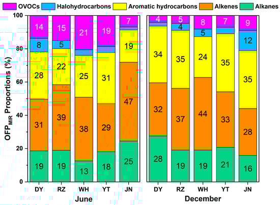 OFPMIR proportions for different types of VOCs in Jinan (JN), Dongying (DY), Rizhao (RZ), Yantai (YT), and Weihai (WH) in June and December.