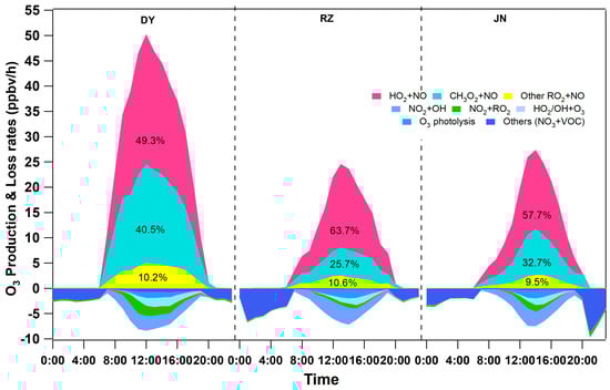 In order to understand the causes of O3 pollution in different cities from the perspective of chemical reaction pathways, the typical coastal cities DY and RZ and the inland city JN were selected for comparison. O3 production was simulated based on MCM for these cities on days with high O3 concentration (DY: 6 June; RZ: 22 June; JN: 8 June). Figure 7 showed the in situ O3 photochemistry production mechanism on high O3 pollution days. It was found that the net O3 production rates in DY, RZ, and JN were 27.87, 10.24, and 10.37 ppbv/h, respectively. This is comparable to the research from another coastal city Xiamen, where the net O3 production rate was 9.1 ppbv/h [45]. The pathway that contributed most to O3 production was HO2 + NO, which had daytime contribution rates of 16.43, 8.98, and 8.19 ppbv/h in DY, RZ, and JN, accounting for 49.29%, 63.66%, and 57.72%, respectively. RO2 + NO is another pathway with a significant contribution to O3 production, which is divided into CH3O2 + NO with the largest contribution and other RO2 + NO. The rate of CH3O2 + NO was 13.50, 3.63, and 4.67 ppbv/h, accounting for 40.50%, 25.72%, and 32.74%, respectively.