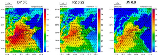 The abovementioned analysis shows that the in situ O3 production rate is different from the observed O3 concentration variation. This is because the O3 concentration variation is affected by a combination of in situ photochemical reactions and physical processes [22,23]. The diurnal variation of the net O3 production rate (O3-Chem) and regional transport O3 (O3-Tran) as well as the observed O3 production change rate (d(O3/dt)) in cities during the O3 pollution process are shown in Figure 8. The rate of O3 change was calculated from the derivative of the observed O3 time series (O3-meas = d(O3)/dt). The rate of in situ O3 production (O3-chem) is calculated based on the MCM model. The difference between them is the rate of O3 change for physical transport (O3-tran = O3-meas − O3-chem), which incorporates horizontal regional transport and the role of the atmospheric mixed layer [22,23]. To understand the effect of regional transport on O3 concentration, the spatial distribution of temperature and wind vectors during the O3 pollution process in Shandong Province was simulated based on the WRF-Chem model shown in Figure 9.