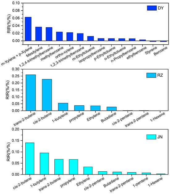 To investigate the effect of individual species on O3 production, sensitivity experiments were conducted on individual species of the most sensitive VOC species in each city. As shown in Figure 11, in DY, the most sensitive species among aromatic hydrocarbons was m-Xylene + p-Xylene, followed by mesitylene, 1,2,4-trimethylbenzene, and methylbenzene. The species with the highest contribution to O3 production among alkenes was butene, in JN and RZ. Moreover, trans-2-butene, cis-2-butene, and 1-butylene made a significant contribution to O3 production in RZ with RIRs of 0.26, 0.23, and 0.05, respectively. It was found that decreasing the concentration of cis-2-butene, 1-butylene, and trans-2-butene led to the greatest change in O3 production rate at JN, with RIRs of 0.14, 0.95, and 0.07, respectively. This result is consistent with previous studies in Zibo [19], where C2–C5 alkenes and C7–C9 aromatic hydrocarbons contributed greatly to O3 production. It was found that aromatic hydrocarbons were the characteristic compounds of architectural coatings and solvents [50], and cis-2-butene, 1-butylene, and trans-2-butene all originate from vehicle exhaust and liquefied petroleum gas (LPG) [51]; therefore, cities should further implement targeted control of their emissions.