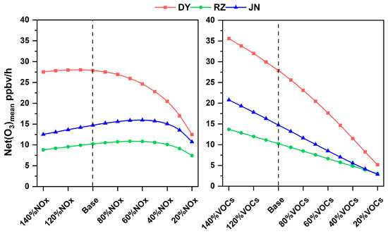 Different concentration gradients of emission reduction revealed that O3 production in three cities was more sensitive to VOCs compared to NOX, and reducing VOC concentration can lead to a significant reduction in net O3 production rate. Based on the slope (Figure 12), it can be concluded that O3 production in DY is the most sensitive to VOC emission reduction. Further, based on the RIR values in response to the varied reduction ratio (Table 2), it is seen that RIR values increase with the incremental reduction of VOCs in DY, which indicates a higher reduction rate of O3 production. However, the scenario of 10% abatement of VOC concentration in RZ has the most significant effect on O3 production, with an RIR of 0.951. In contrast, the response of emission reduction in JN is much more complex. In the context of reducing VOC concentration, when VOC concentration is reduced by 20%, O3 sensitivity is the highest, and the RIR is 1.12. However, a 10% increase in VOC concentration has a stronger O3 production response, with an RIR of 1.15. This situation indicates that VOC emission in JN can lead to a significant increase in the O3 production rate.