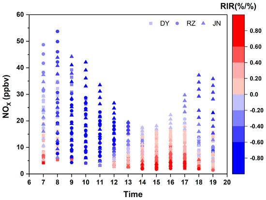 Distribution of NOX concentration variation and RIR during the daytime (7:00–19:00) in Dongying (DY), Rizhao (RZ), and Jinan (JN).