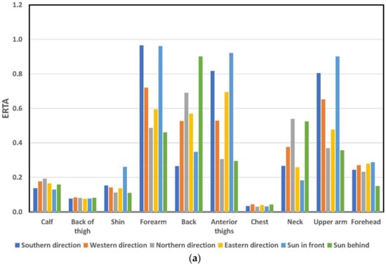 Figure 6a–c shows the ERTA values at the different body sites as a function of the bicycle orientation for measurements performed at solar elevations between 60 and 65° (Figure 6a), 40 and 45° (Figure 6b), and 20 and 25° (Figure 6c). The forearms, back, anterior thighs, and upper arms are the body sites that receive the highest UV irradiance. ERTAs even reach values above 1. At solar elevations above 40°, UV irradiance may increase to above 100% when the body sites are facing the sun. At solar elevations below 25°, the difference in UV irradiance between the bicycle orientations decreases. This may be attributed to the increasing proportion of the diffuse component of UV radiation.