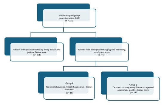 There were 227 patients (149 men and 178 women) with a mean age of 70 (64–74) years presenting anginal symptoms of median Canadian Cardiovascular Society (CCS) grade 2 (1.2–2.5) who underwent diagnostic coronary angiographies. Out of the whole group, 146 presented significant atherosclerotic coronary artery disease. The remaining 63 subjects with nonsignificant coronary culprit lesions estimated to have a Syntax score of zero upon initial examination were taken into account in further analyses, as presented in the study flow chart (Figure 1).