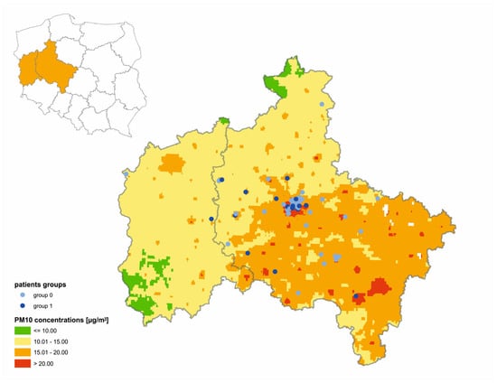 A geo-map was made, which presents the relation between long-term PM10 air pollution exposure in each of the analyzed patients and their habitation place in Figure 2.
