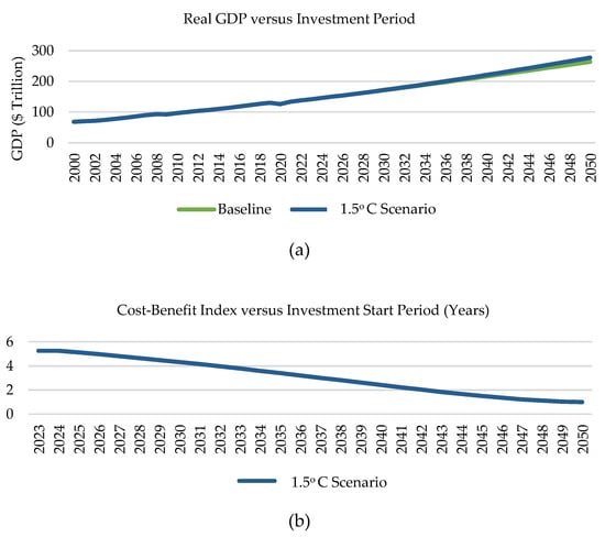 To be able to obtain R, the possible growth rate of GDP from the different investment scenarios is used as depicted in Tables S5–S9. An average GDP growth rate for the specified period (between 2023 and 2050) of CB analysis was used as input for the discounting emissions cost flow rate calculated using Equation (11) in this study.